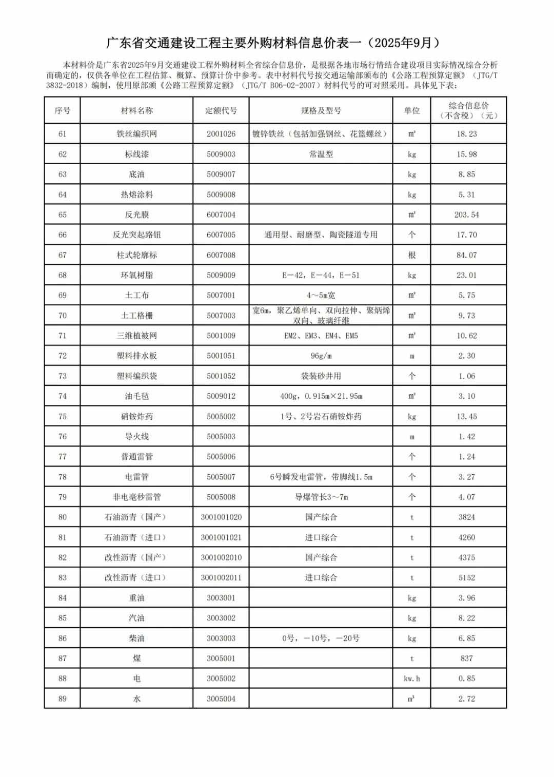 本材料價是廣東省2025年9月交通建設工程外購材料全省綜合信息價,是根據各地市場行情結合建設項目實際情況綜合分析而確定的,僅供各單位在工程估算、概算、預算計價中參考。表中材料代號按交通運輸部頒布的《公路工程預算定額》(JTG/T 3832-2018)編制,使用原部頒《公路工程預算定額》(JTG/T B06-02-2007)材料代號的可對照采用。具體見下表: