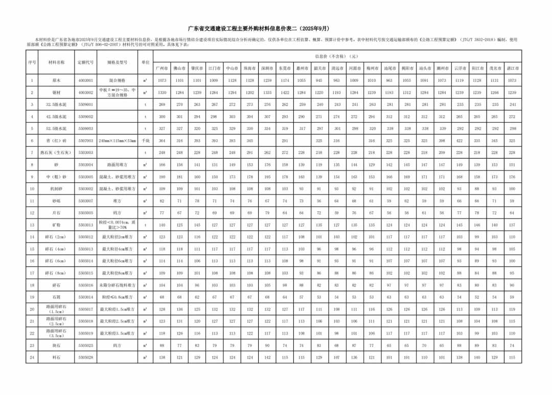 轉發|廣東省交通建設工程主要外購材料信息價(2025年9月)